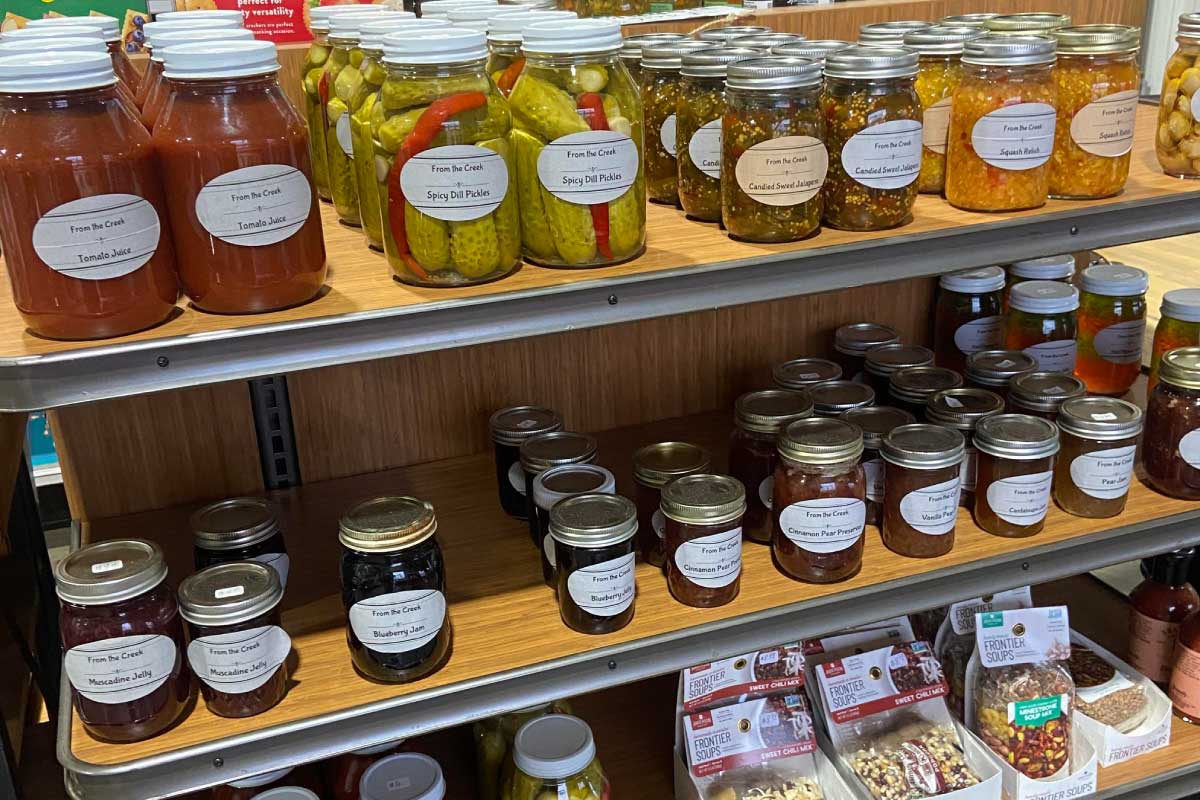 You’ll find spicy dill pickles, hot pepper jelly, and squash relish. If you’re a baker, you can pick up your own sourdough starter. And if you need daily essentials like crackers or beverages, it’s all there, saving you an extra stop at the grocery store.